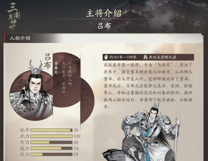 对于吕布的设计,制作组根据吕布的生平和典故进行了多番考据,将极具吕布特色的作战风格融入到技能设计中。吕布有骑兵和统帅两种兵种可以选择,同时个人作战能力也极强,是大范围群攻型角色,预测会是一名碾压型武将,很符合他三国战神的名号。